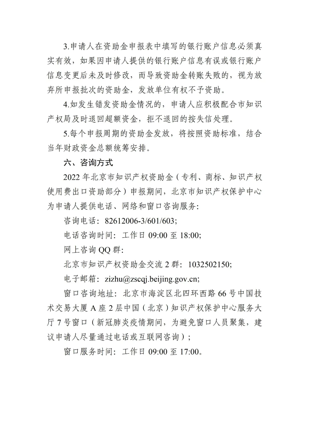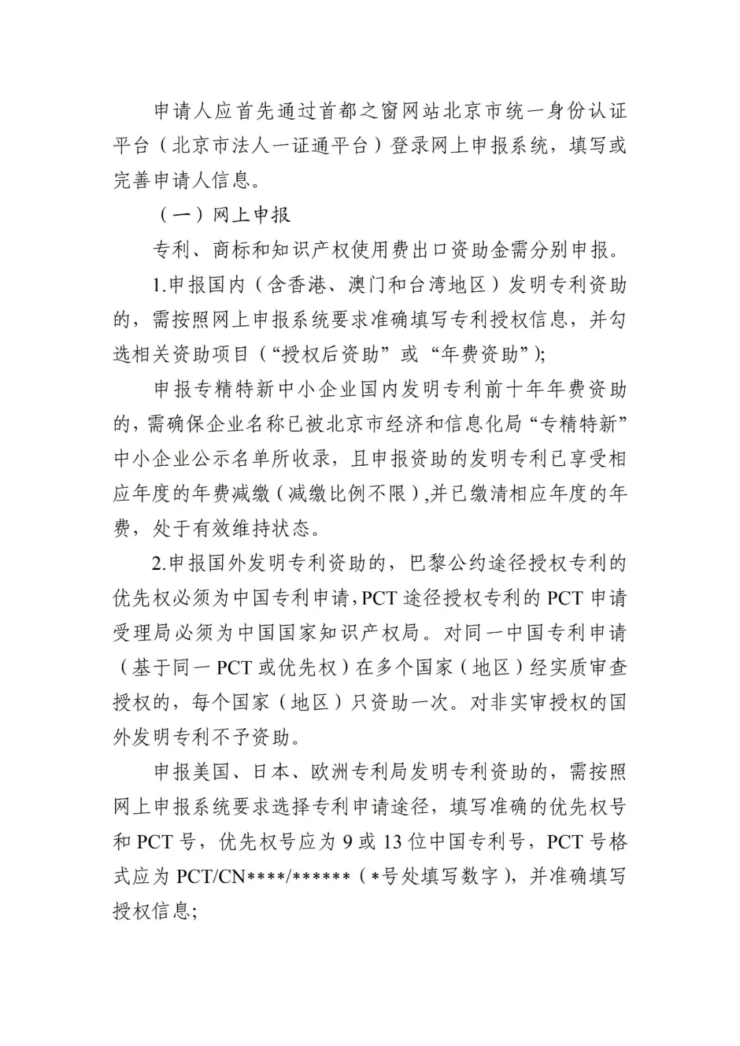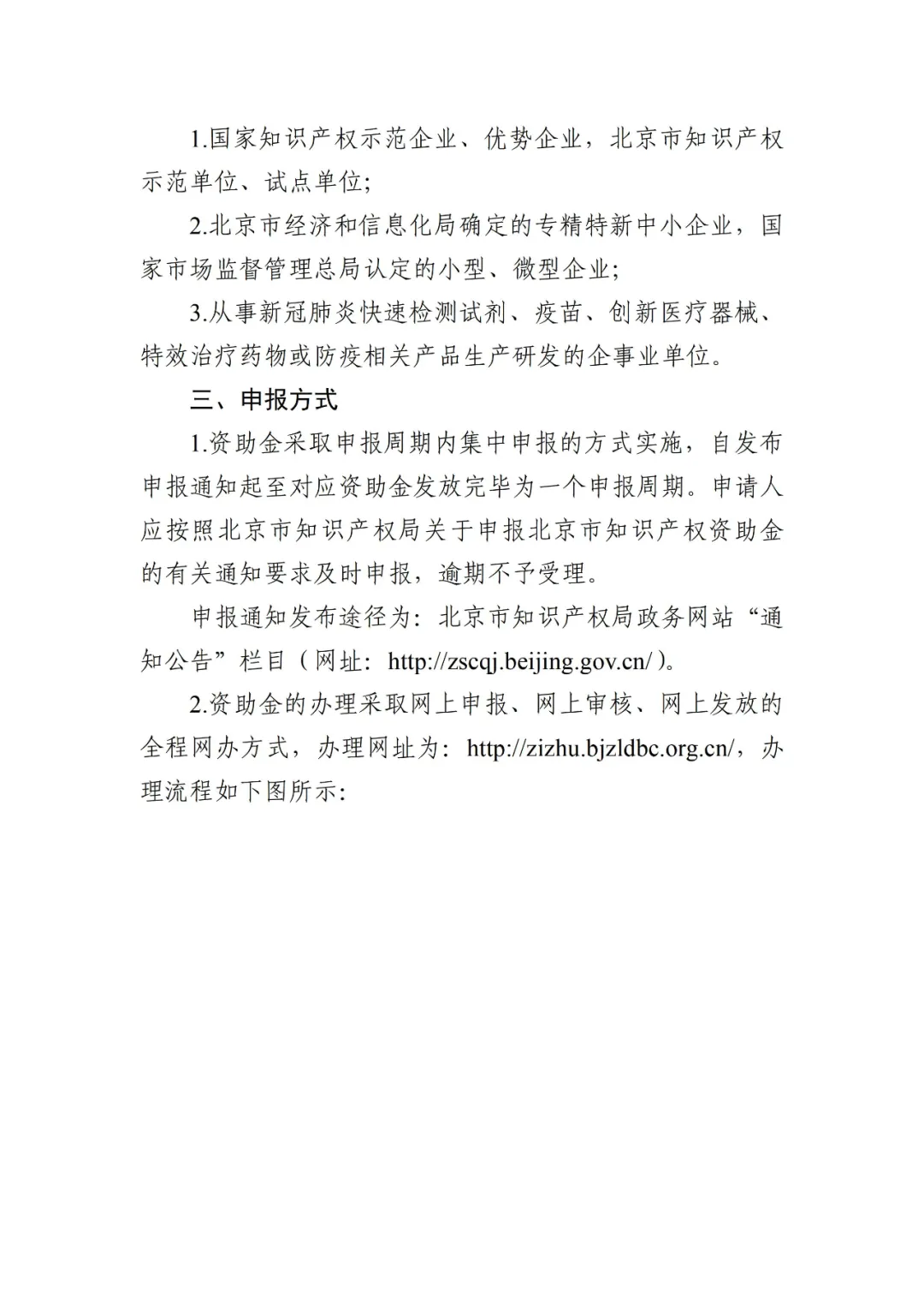 北京市知识产权资助金(专利、商标、知识产权使用费出口资助部分)的申报采取全程网办方式,申请人需在北京市知识产权资助金网上申报系统进行申报,详情请参考《2022年北京市知识产权资助金申报指南》(见附件)。