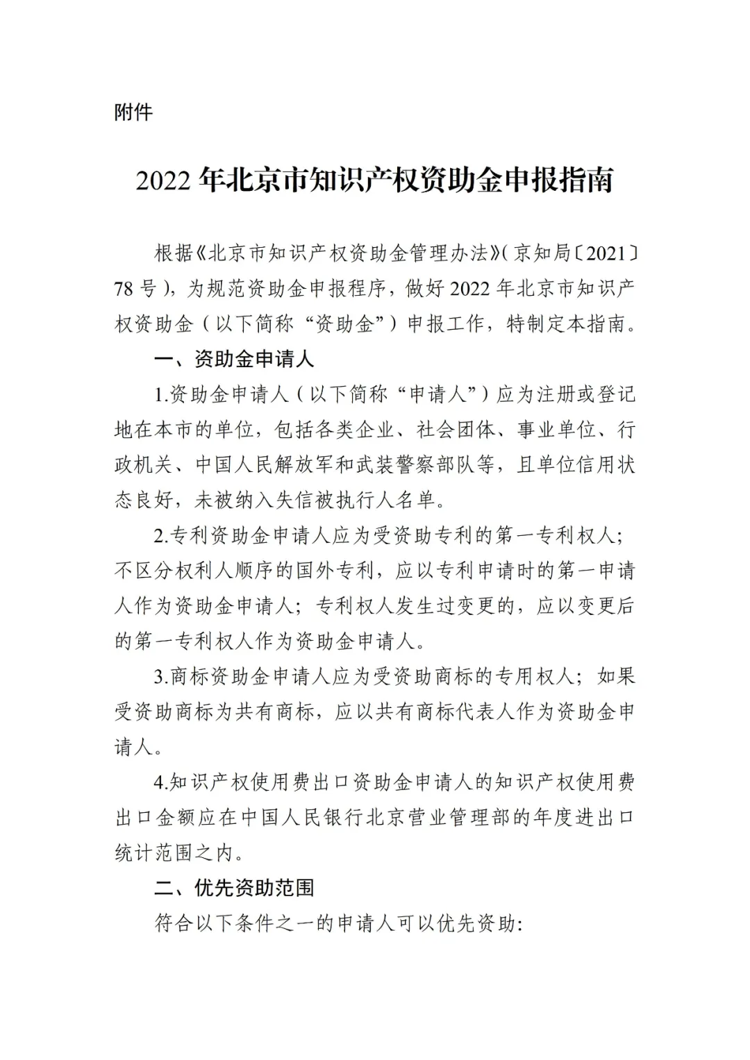 根据《北京市知识产权资助金管理办法》(京知局〔2021〕78号)的有关规定,现就2022年北京市知识产权资助金申报事宜通知如下: